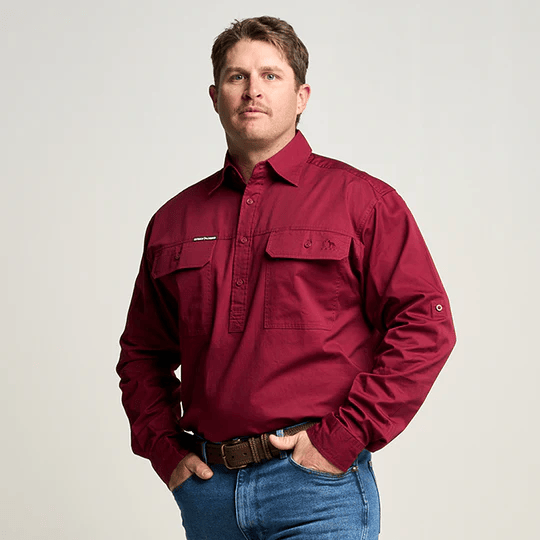 OBCMWS001-BUR KILCOY | Mens Half Button Long Sleeve Work Shirt - Burgundy