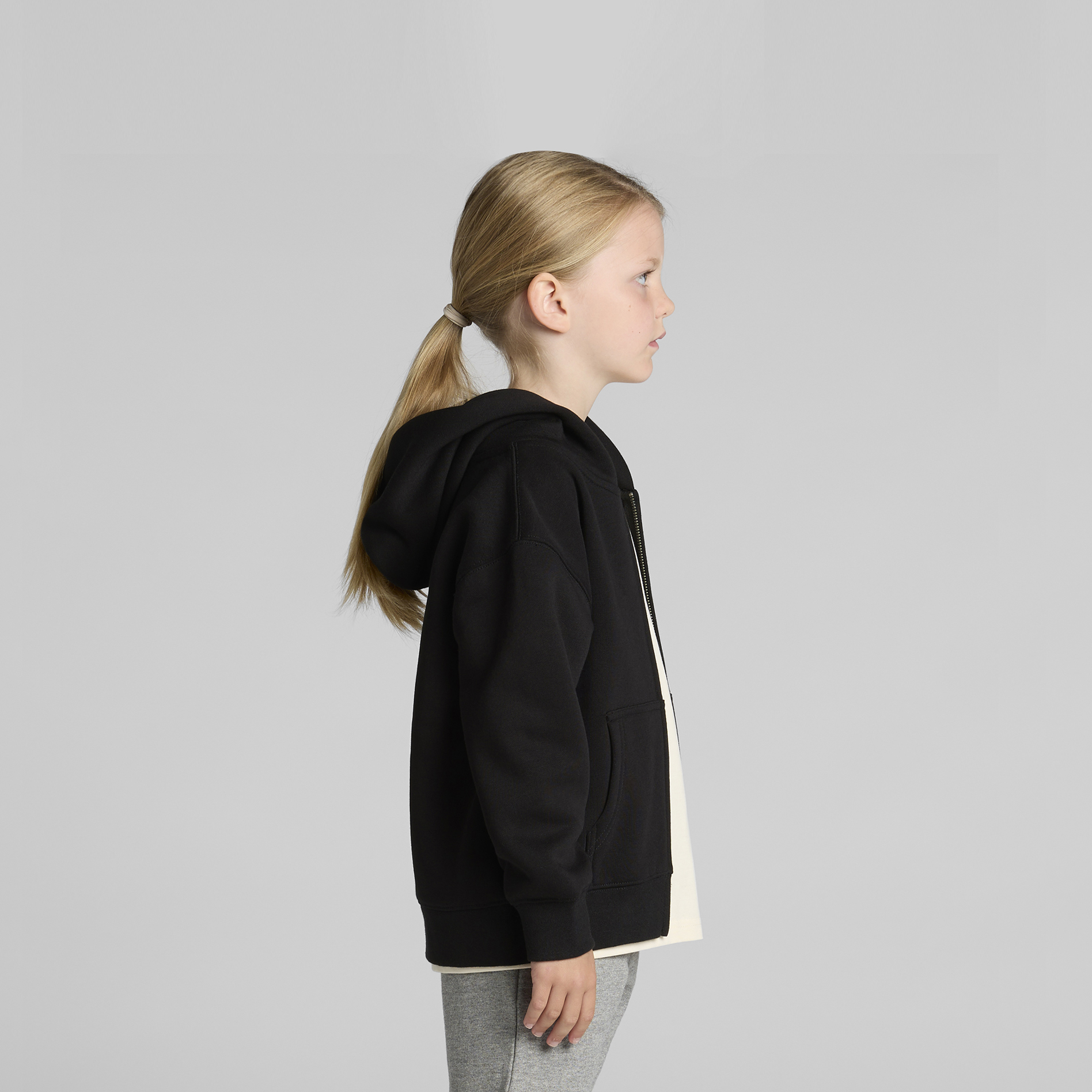 Construction: Zip hood, drop shoulder, kangaroo pocket, self-fabric lined hood, no drawcord, YKK zip, sleeve cuff ribbing