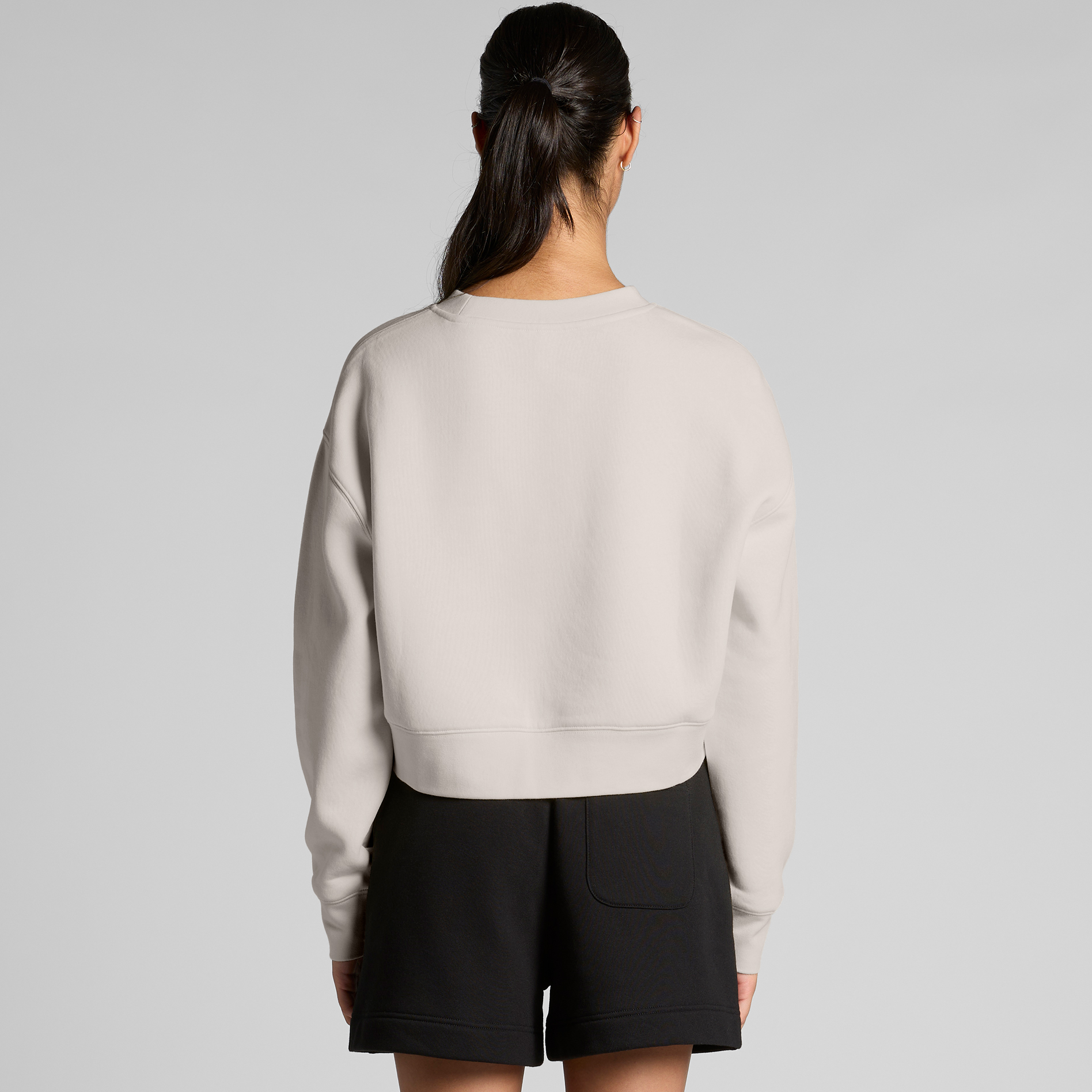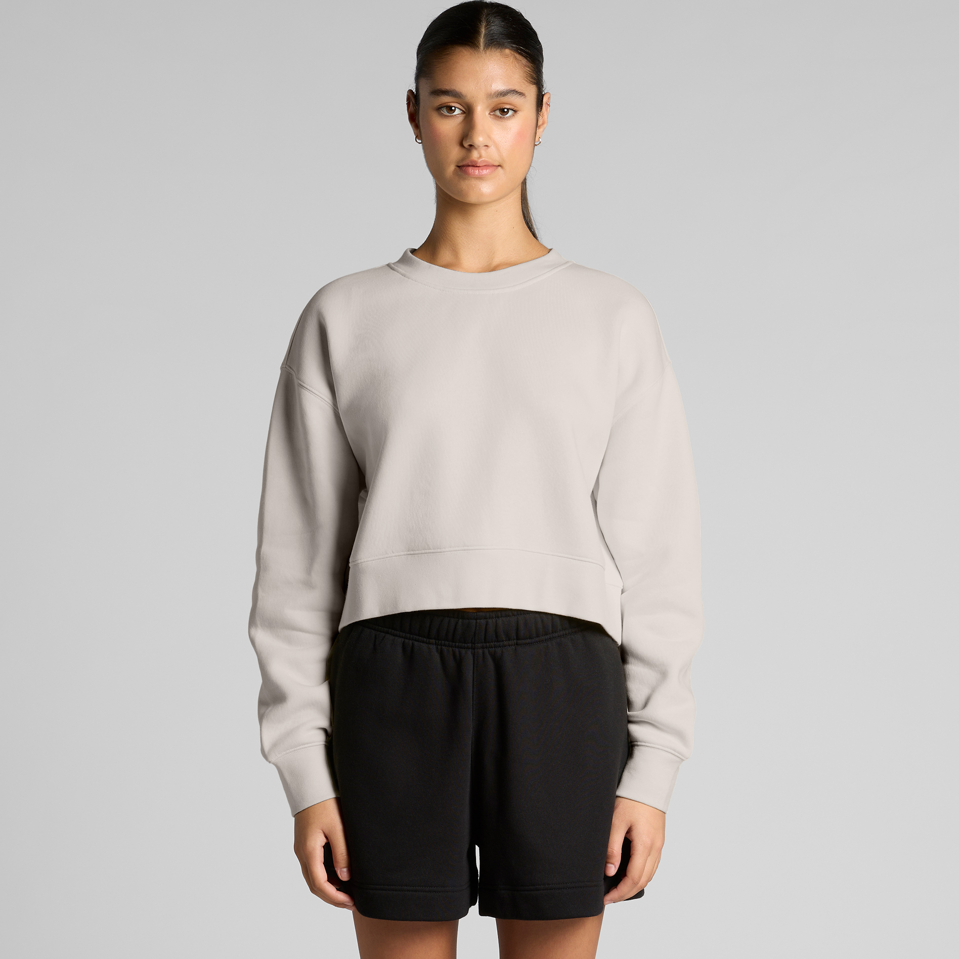 Pre-shrunk to minimise shrinkage, pullover crew, drop shoulder, cropped full length, crew neck, sleeve cuff and hem ribbing