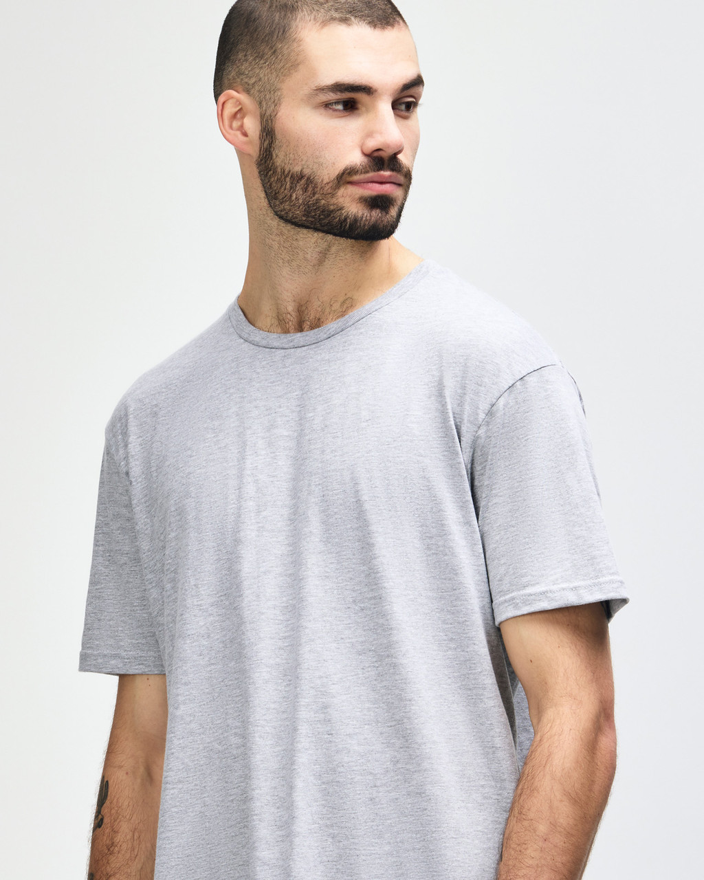 Semi-Fitted, Uni-Sex, 153g/m2 (144g/m2 in white), 100% Combed Ring Spun Cotton (Fibre content varies by colour), 31/1, Seamless double-needle 1.9 cm collar, Taped neck and shoulders, Rolled forward shoulder, Double-needle sleeve and bottom hems, High stitch density fabric, Tear away label